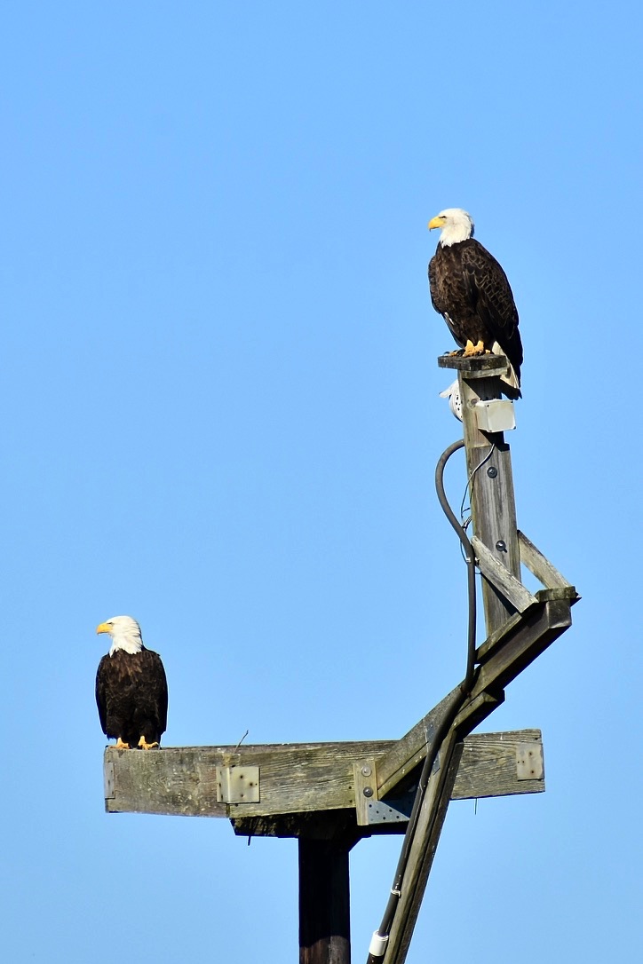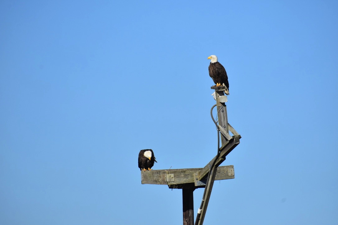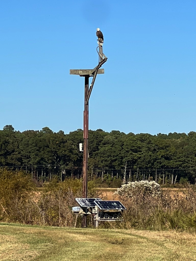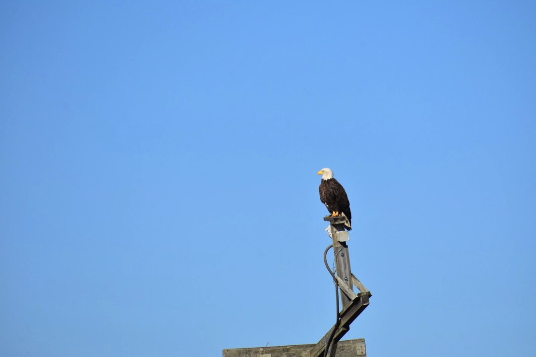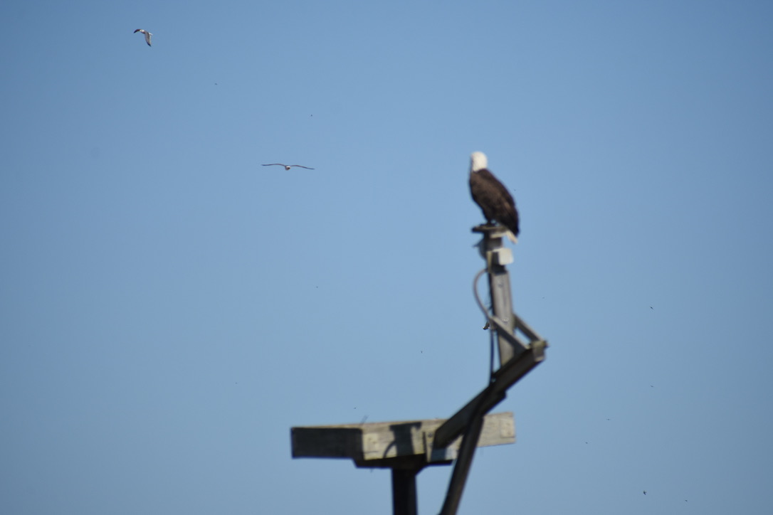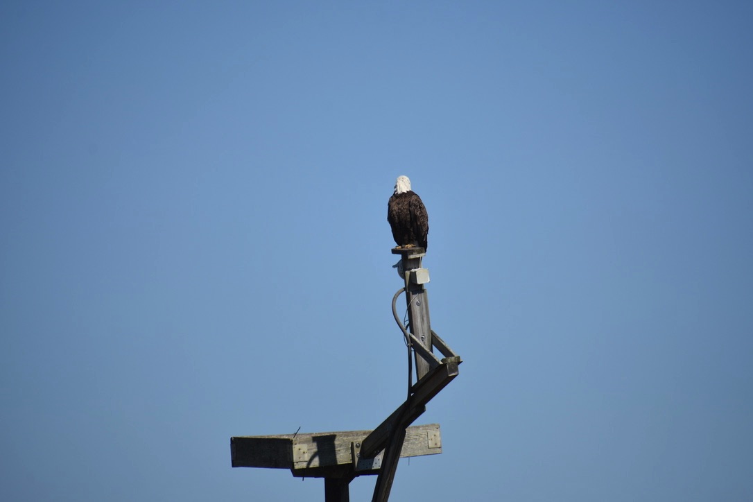 Eagle on osprey platform. Across the marsh is the visitor center.