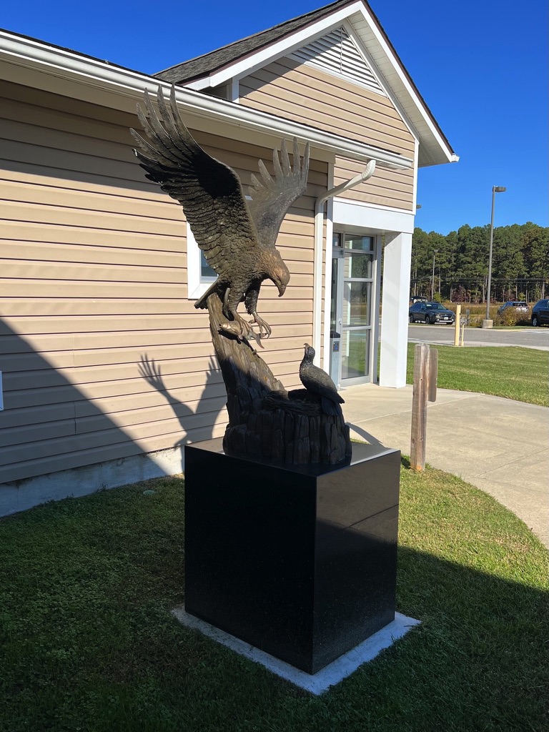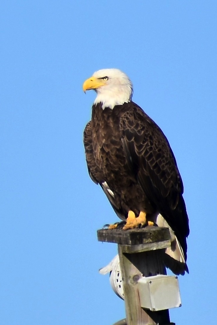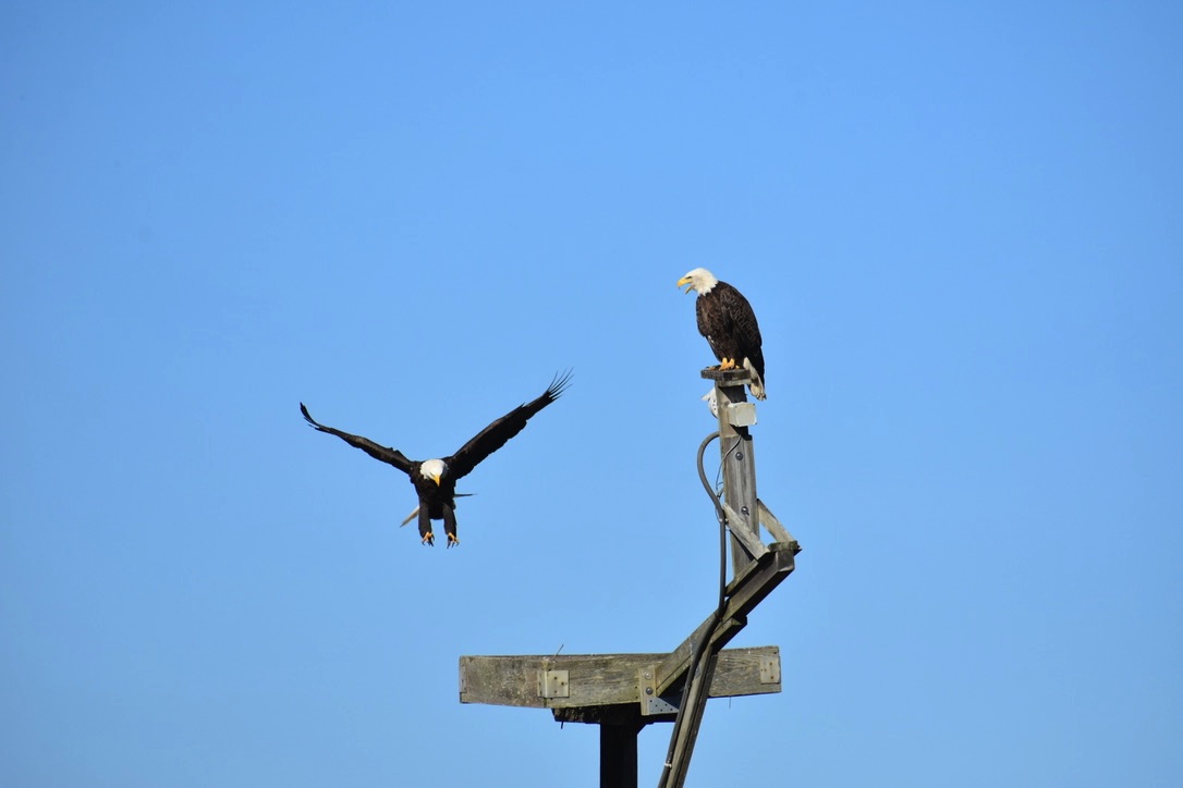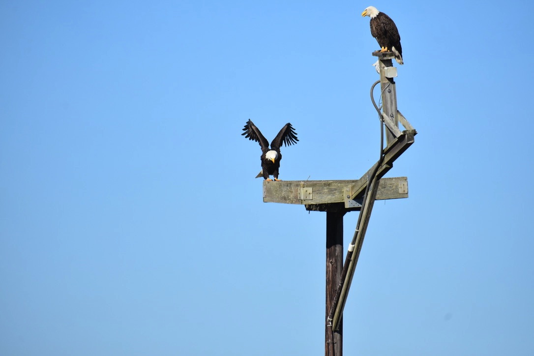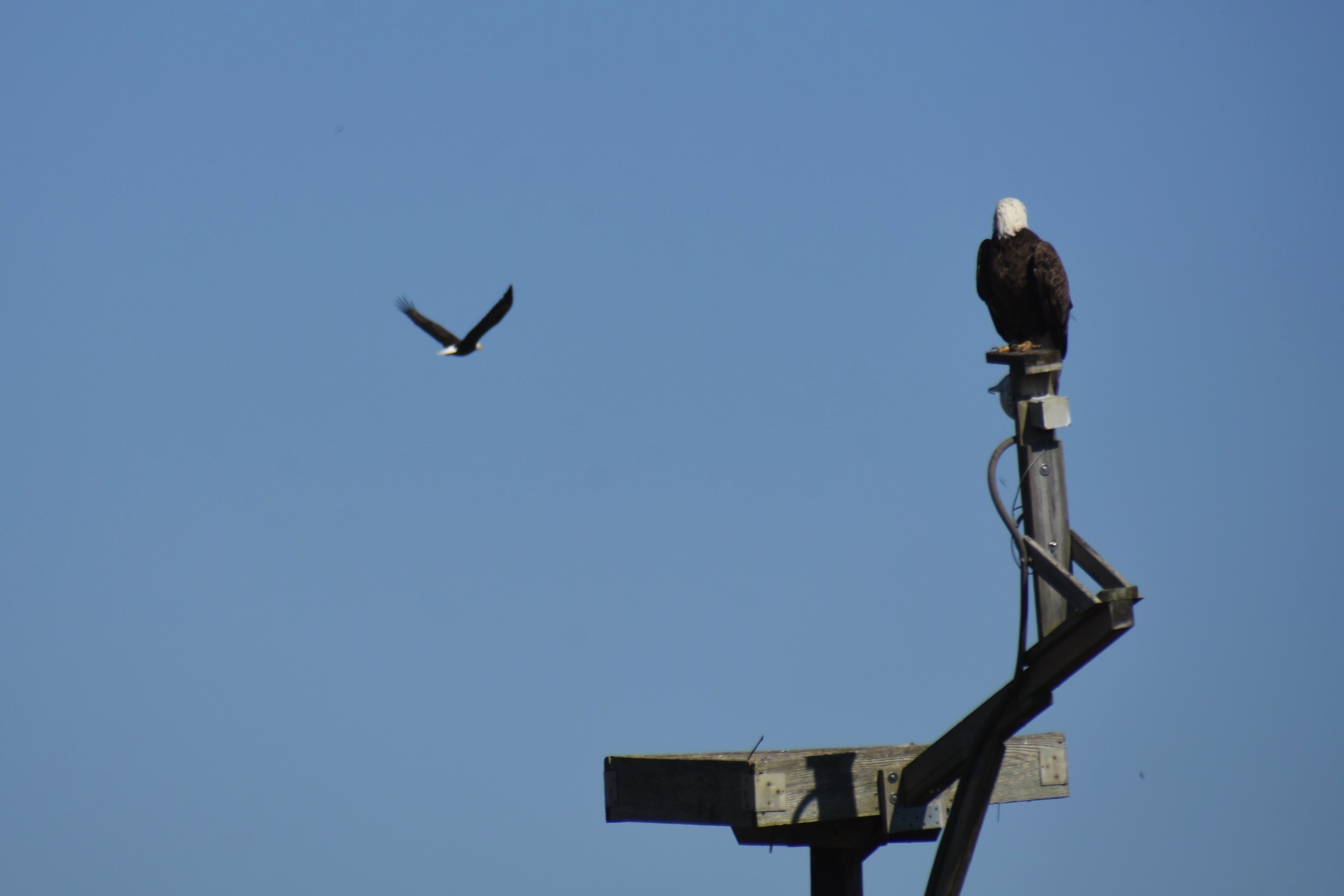 Eagle on osprey platform. Across the marsh is the visitor center.