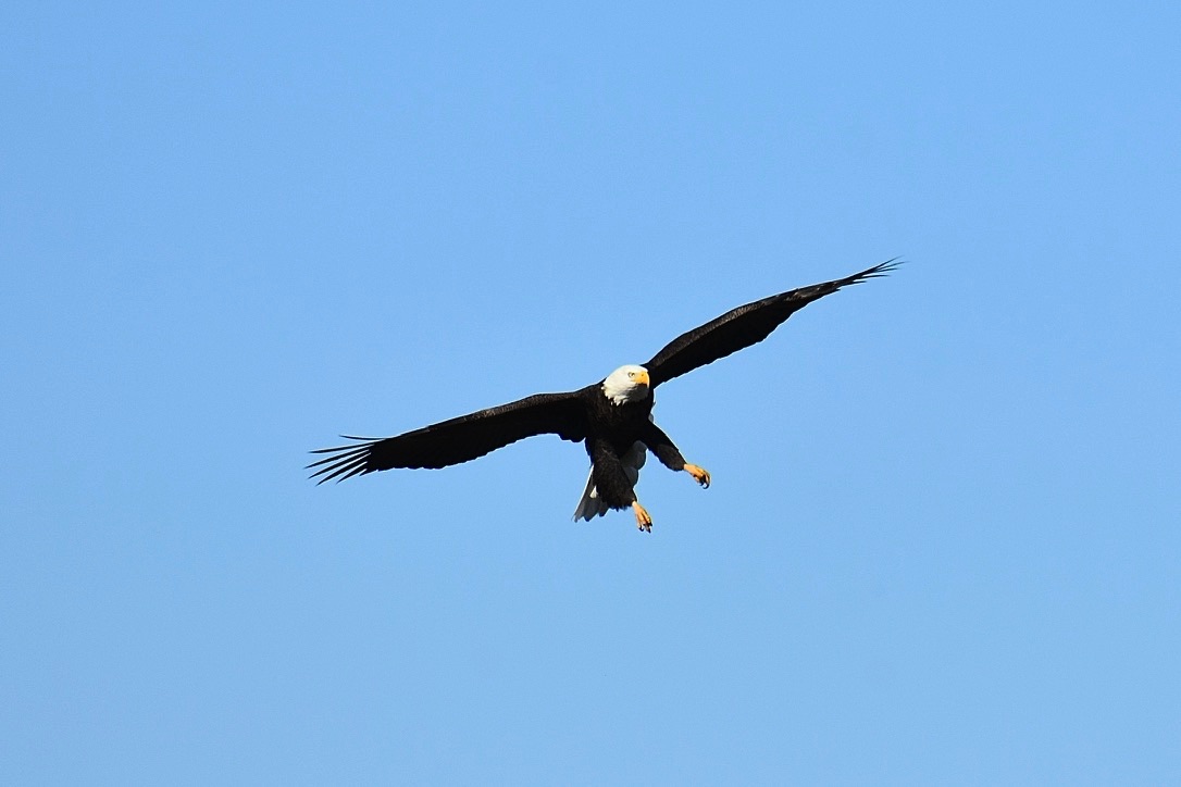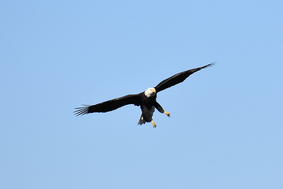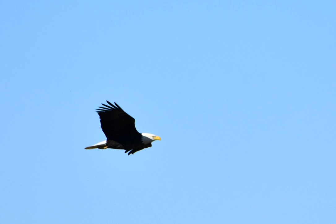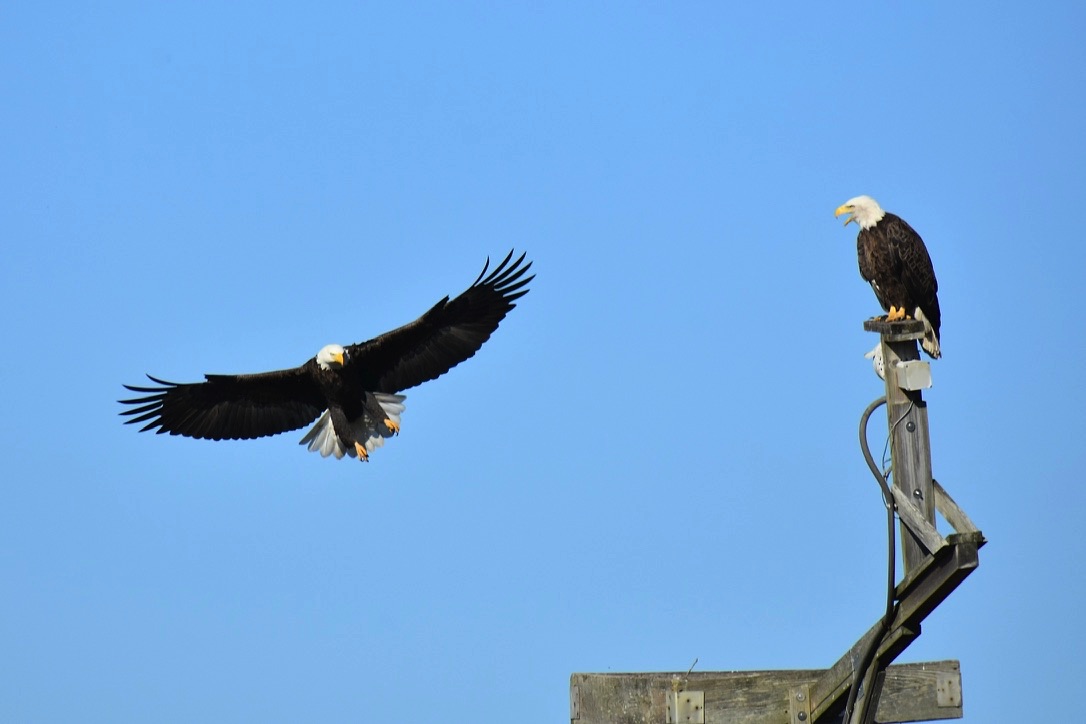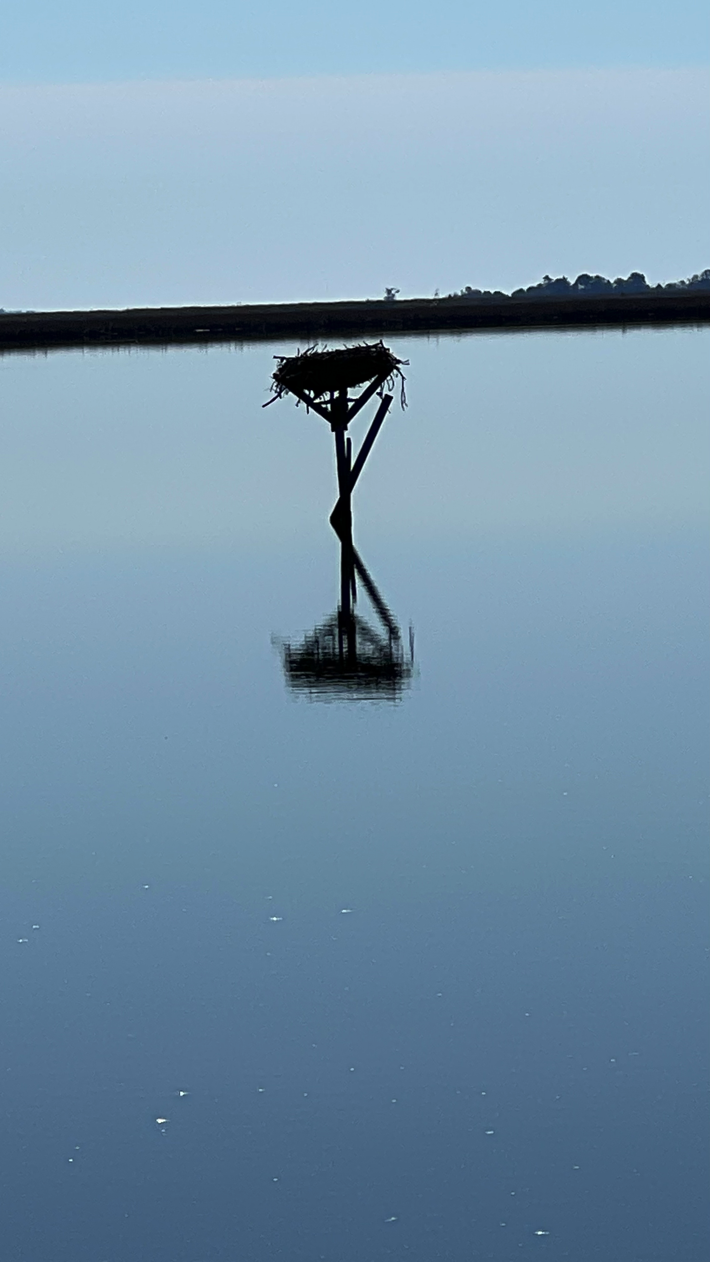 Eagle on osprey platform. Across the marsh is the visitor center.